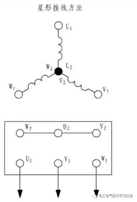 星形接法:三个绕组的U2、V2、W2连在一起,U1、V1、W1分别接电源。W1、V1之间为线电压:380V;W1、V1之间电压为380V;U1、V1间电压为380。U1、U2之间为线电压:220V;V1、V2之间电压为220V;W1、W2之间电压为220V。每一个绕组所流过的电流为相电流,三相电源中相线所流过的电流为相电流。