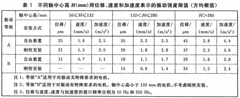 注3:一台电机,自身平衡较好且振动强度等级符合表1的要求,但安装在现场中因受各种因素,如地基不平、负载机械的反作用以及电源中纹波电流的影响等等,也会显示较大的振动。另外,由于所驱动的诸单元的固有频率与电机旋转体微小残余不平衡的激励频率极为接近也会引起振动,在这些情形下,不仅只是对电机,而且对装置中的每一单元都要检验,见ISO10816-3。