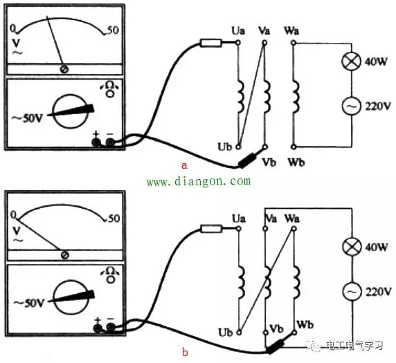交流法判别绕组首尾如图3a所示,先讲两相绕组的两个端子连接起来,万用表置于交流电压档,红、黑表笔分别接此两相绕组的另两个端子,然后给余下的一相绕组接灯泡和220V交流电源,如果表针有电压指示,表明红、黑表笔接的两个端子为异名端(两个连接起来的端子也为同名端),再更换绕组做上述测试,如图3b所示,图中万用表指示电压值为0,表明UbWa为同名端(UaWb为同名端)。找出各相绕组的同名端后,将性质相同的三个同名端作为各绕组的首端,余下的三个端子则为各绕组的尾端。