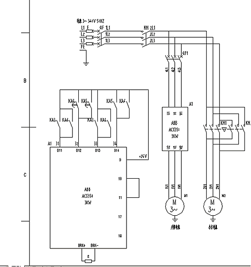 因为在下降过程中如果按键频率很高会导致制动不起作用,导致溜钩。现加两个延时触头保证抱闸的有效。变频器的宏选择交变宏。由于葫芦本身抱闸过于紧,在低速的时候频率过底的时候会打不开抱闸,但是调试下提升下频率就可以解决了。
