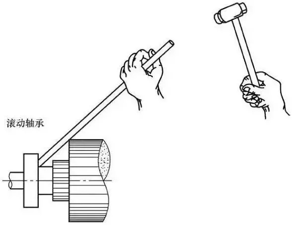 当没有专用拉具或不适于采用拉具拆卸时,可将金属棒顶在轴承的内套圈上,用手锤敲打金属棒,将轴承慢慢地从转轴上敲出,如图1-6所示。敲打时为防止轴承损坏,用力不能过于猛急,应轮流敲打轴承两对应侧,不能只敲打一侧,以使轴承内套圈受力均匀。