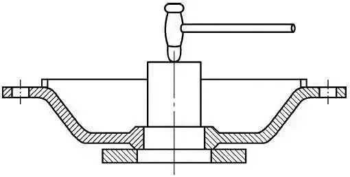 将轴承放置在圆筒上,在轴承内套圈的下面垫两块铁板,再将铁板搁置在一只内径略大于转轴外径的圆筒上,如图1-7所示。为防止转轴弯曲及端部变形,不能用手锤直接敲打转轴端面,应在转轴端面上垫一块硬木板或铜块,再用手锤敲打木板或铜块。敲打时的着力点应对准转轴的中心,用力亦不能过于猛急。为防轴承脱落下时损坏转子或转轴,圆筒的底部应放置一些柔软的东西。此外,当轴承逐渐松动时,敲打力度亦应随之减小。