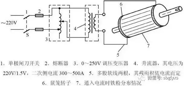 检查时将开关S合上,调节调压变压器,使电压从零逐渐升高,待升流器的电流逐渐增大时,转子表面即产生磁场,随后把铁粉撒在转子上。若铁粉一行行地沿着笼条方向整齐排列,表明转子完好无损。如果铁粉排列杂乱无章,或铁粉撒不上去,说明转子存在断条故障。