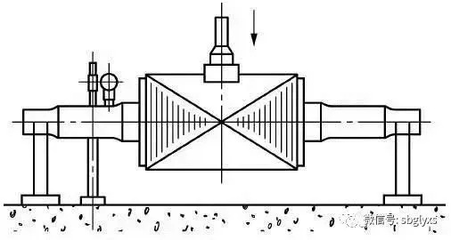 矫正时,将转轴及铁芯(即转子)置于两个等高的支架上,之后将转子转动360°(一周),用百分表测出转轴或铁芯的凸出面,并使凸出面朝上,将压力机的压杆对着凸出面施加压力,同时用百分表检测转轴的弯曲度。当所施加的压力使百分表指示轴已朝反向弯曲时,再缓慢撤除压力,记录百分表的变化值。如此反复施压,逐渐加大压力矫正,使百分表指示轴已反向弯曲0.03~0.05mm为止,即矫轴完毕。
