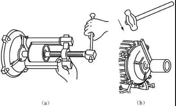 1、先将皮带轮或联轴器上的固定螺钉拧松或敲下销子,并在皮带轮或联轴器的内孔与转轴的接触缝内加入煤油,予以渗透润滑。之后用专用抓手拉轴器(又称拉模)慢慢地把皮带轮或联轴器拉出来,如图1-1中(a)所示。使用拉轴器时要顶正,螺杆中心应对准转轴的中心线,并注意皮带轮或联轴器的受力情况,不要将轮绝缘拉破或损坏拉轴器。