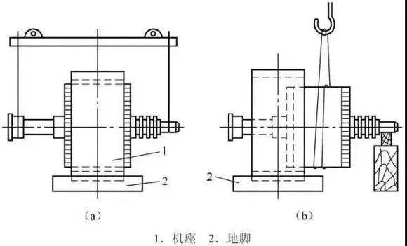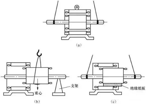 3、若电机转子较重,而轴伸又较长时,可使用吊车将转子抽出。操作时,用吊车的钢丝绳吊住转轴,如图1-3中(a)所示,将转子的重心慢慢移至定子外面,然后将其移出端放在垫有绝缘纸板的支架上,如图1-3中(b)所示。这时再将吊车钢丝绳改系在转子重心处,即可将转子吊出。当电机转子转轴较短时,不能使转子重心移出定子外面,可在转轴上加套一根长度适当的钢管(假轴)。