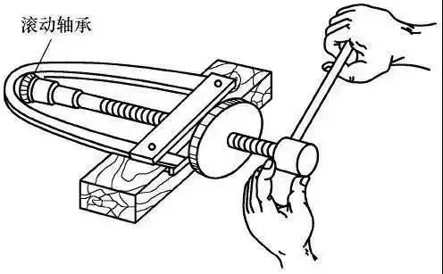 采用专用拉具拆卸时,将拉具的脚放在轴承的内套圈上,而不能放在外套圈上,以防拉坏轴承,如图1-5所示。拉具丝杠的顶点应对准转轴中心,拉具要与转轴保持平行,转动手柄时用力需均匀,且旋转缓慢,以防过急拉坏轴承。为使拆卸容易,亦可在轴承内套圈与转轴间渗入些煤油再拉。